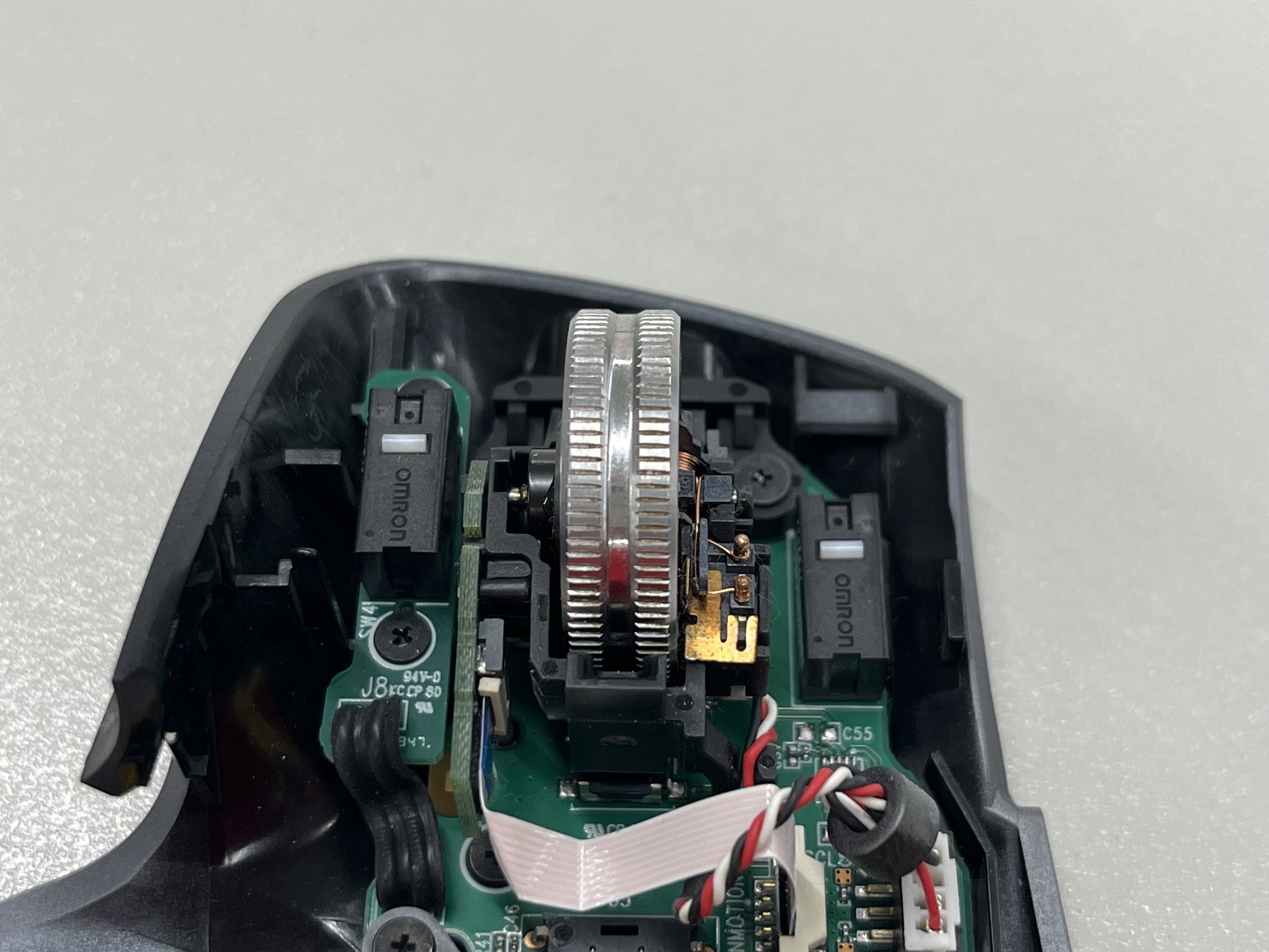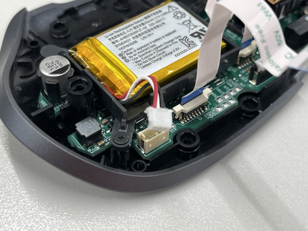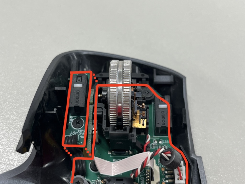 MX Master 3의 자체 모양때문에 왼쪽 클릭 스위치는 다락방같은 느낌으로 별도의 PCB 기판에 살짝 띄워 장착되어 있다.