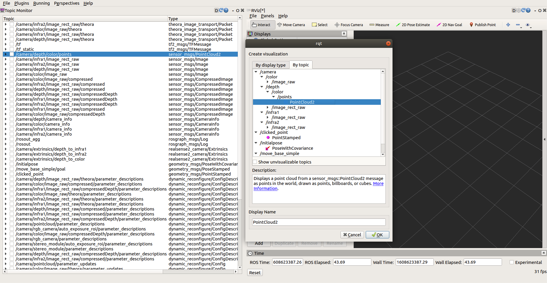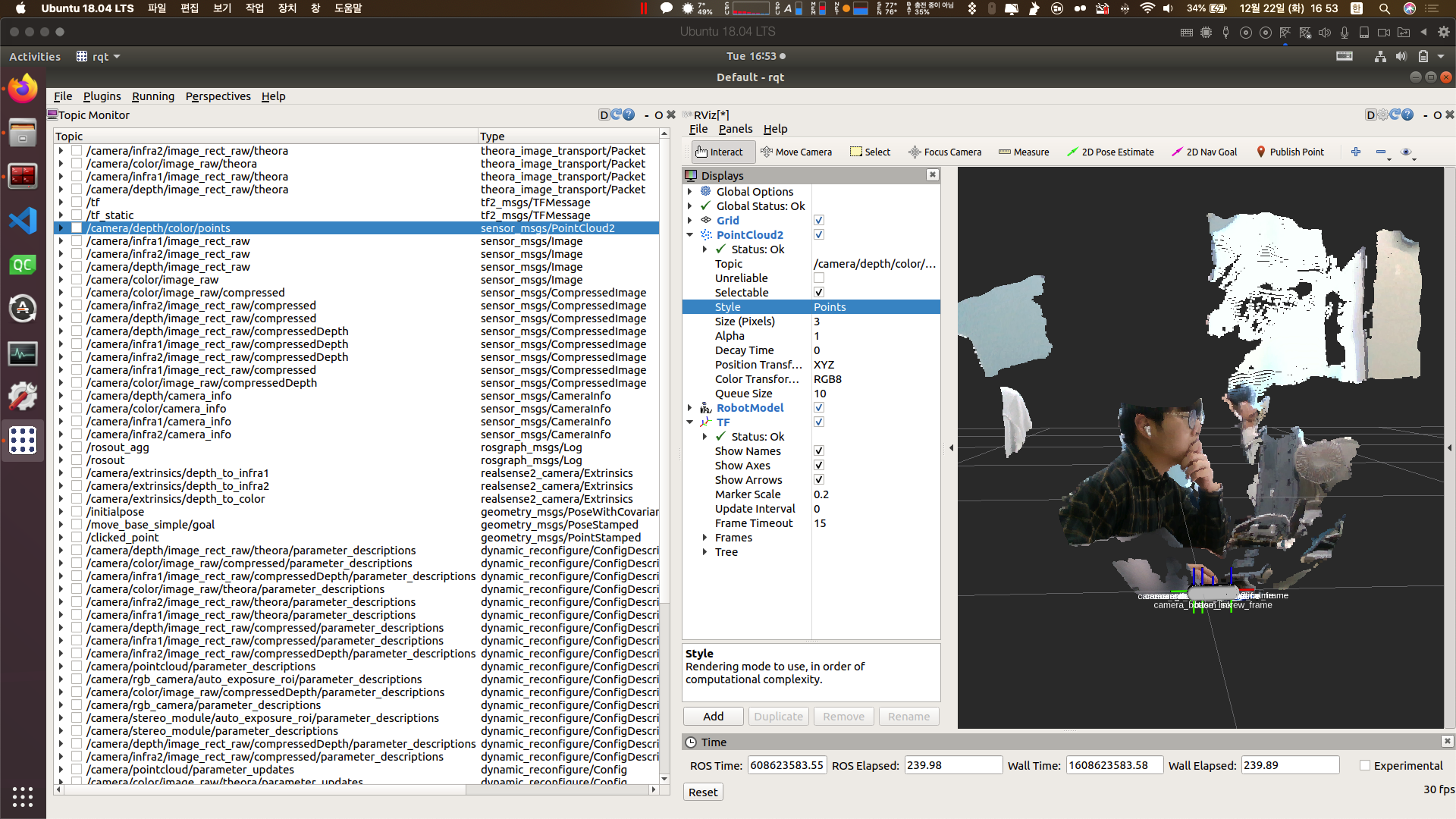 이제 sensor\_msgs::PointCloud2 타입의 토픽이 보이는군요.